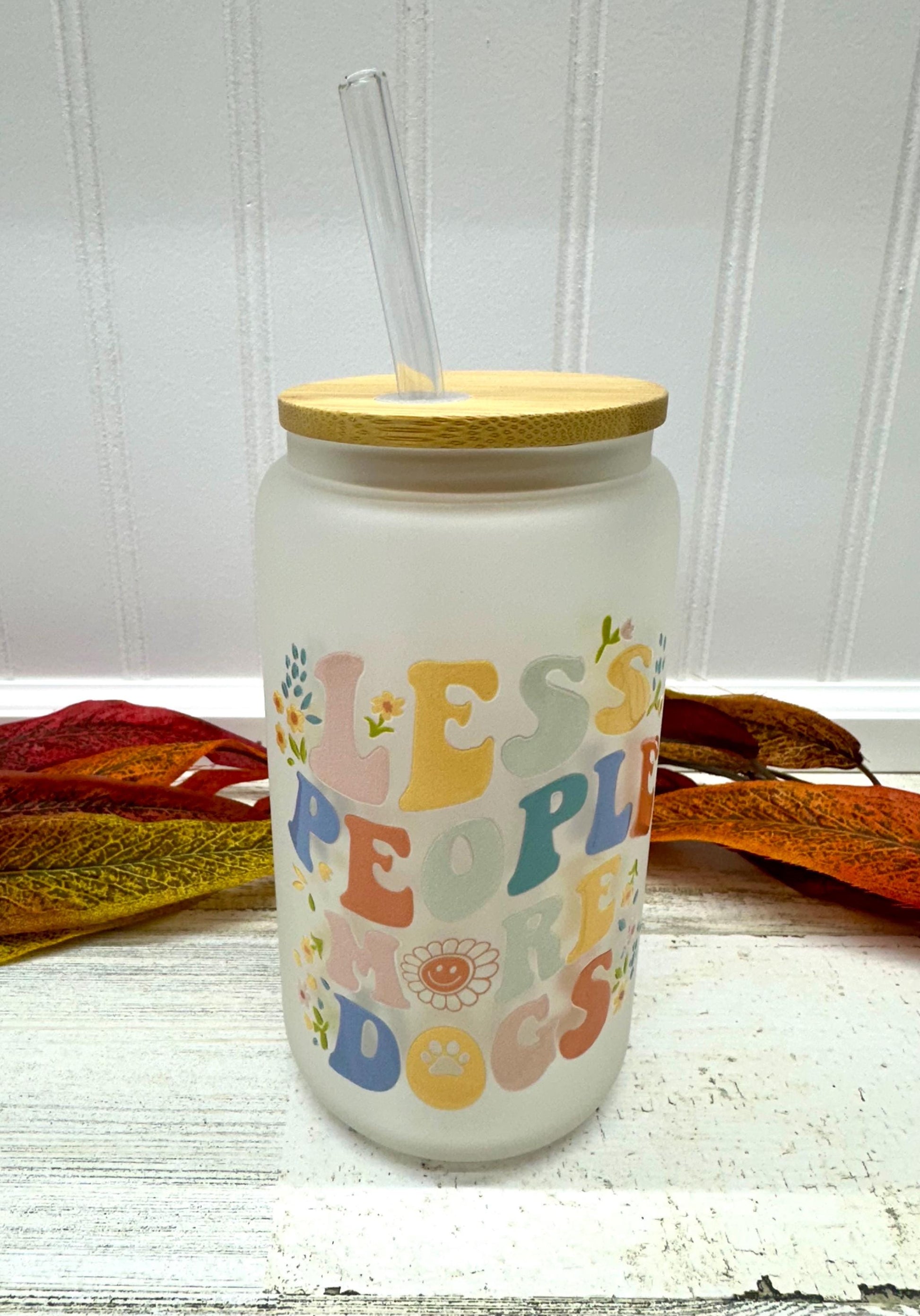 Celebrate your love for furry friends with our fun 16 oz glass can, printed with the witty phrase, “Less People, More Dogs”. Whether you're an animal lover with a sense of irony or just looking for a conversation starter, this tumbler is sure to bring a smile to your face and anyone who reads it.