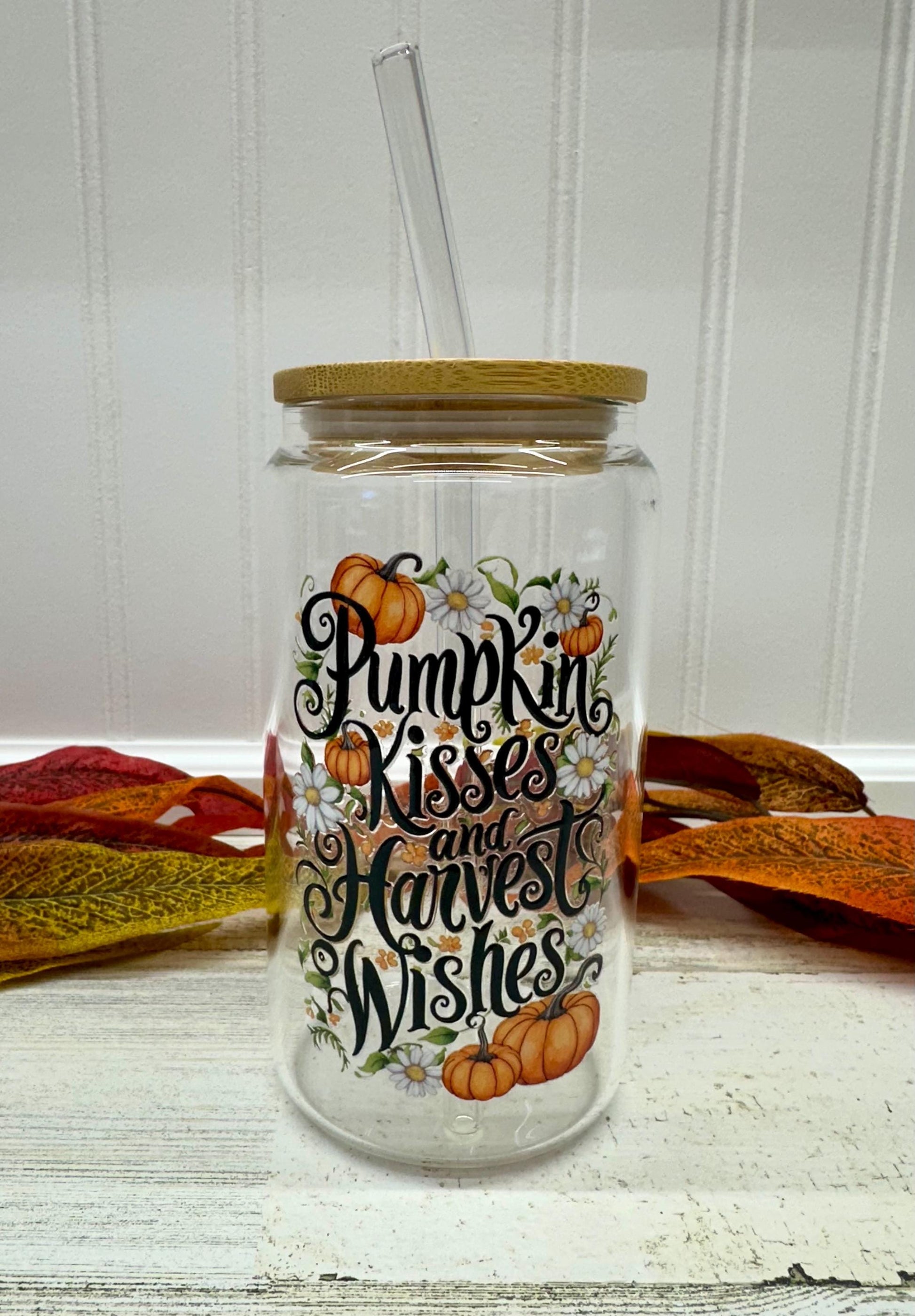 Embrace the cozy fall vibes with our 16 oz glass can tumbler, featuring the charming phrase, “Pumpkin Kisses and Harvest Wishes.” Perfect for sipping your favorite autumn drinks, like pumpkin spice lattes, cider, or iced coffee, this sturdy and stylish glass tumbler is ideal for anyone who loves all things fall. Whether you’re curled up with a blanket or taking a brisk walk, this glass is your go-to for seasonal sips!